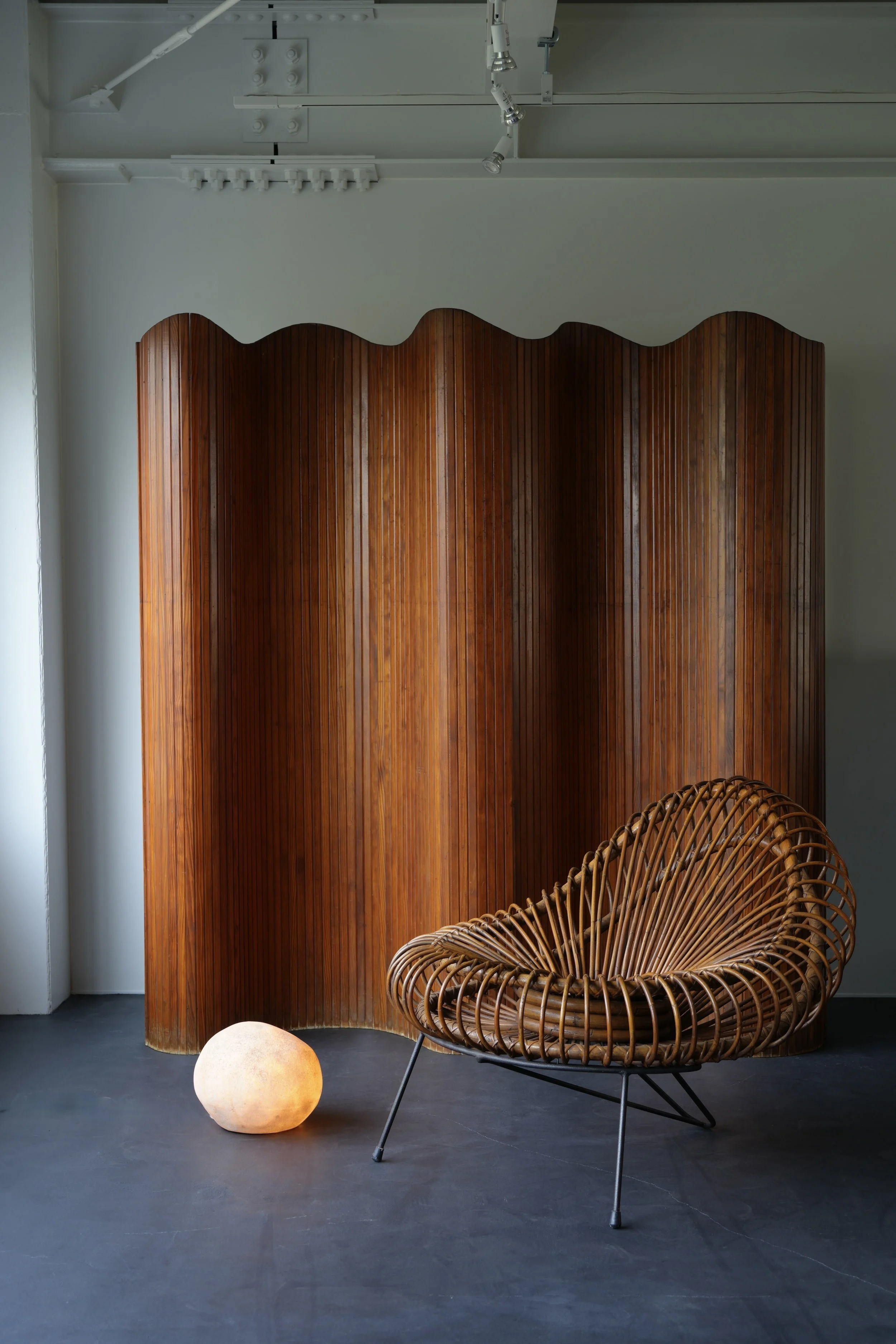 バルーンのような丸みを帯びたフォルムが特徴で、ラタンならではの温かみを感じさせます。大きな編み込みが生み出す抜け感と浮遊感が、空間に軽やかさと開放感を演出します。