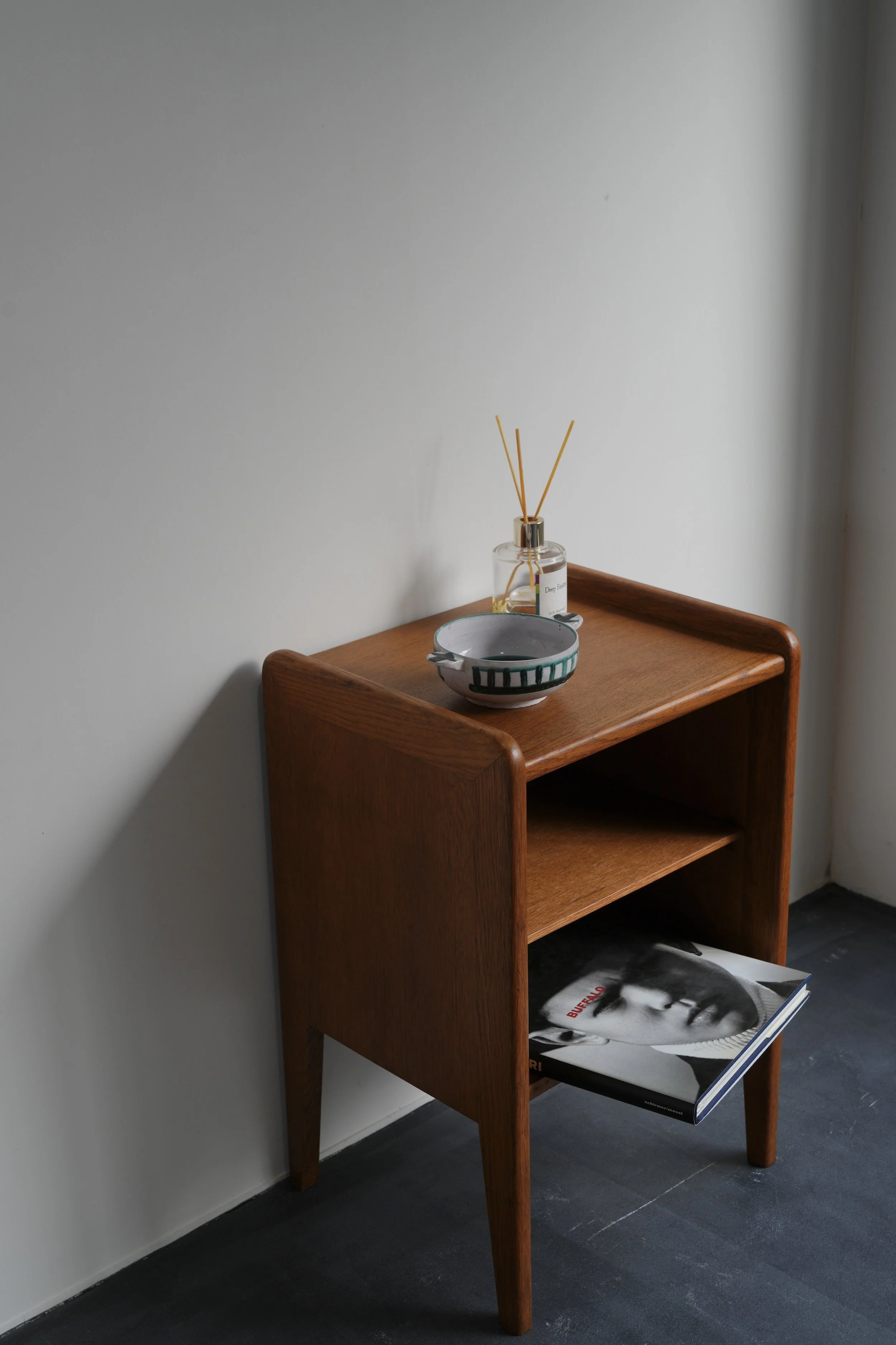 立ち上がったサイドの柔らかな曲線が、このキャビネットの佇まいをより美しく、洗練されたものへと完成させています。足元のテーパードレッグは軽やかで「抜け感」を演出し、実用性とデザインが見事に調和した、フランスらしいエスプリを感じさせる一台です。